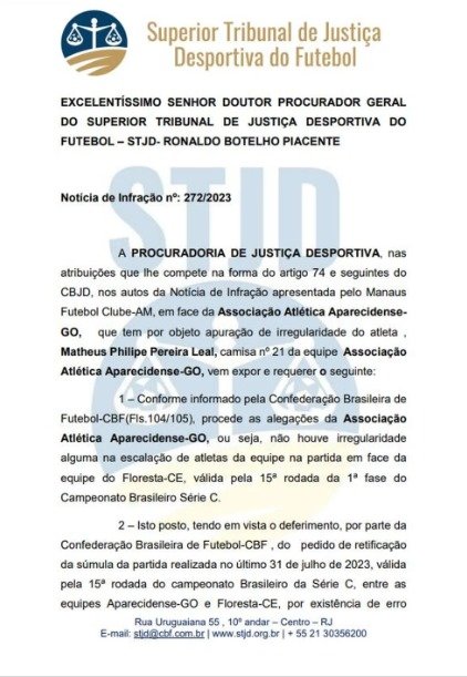 MANAUS (AM) – O Superior Tribunal de Justiça Desportiva (STJD) arquivou a denúncia do Manaus contra a Aparecidense, sobre a possível escalação irregular de um jogador, na 15ª rodada da Série C do Campeonato Brasileiro.