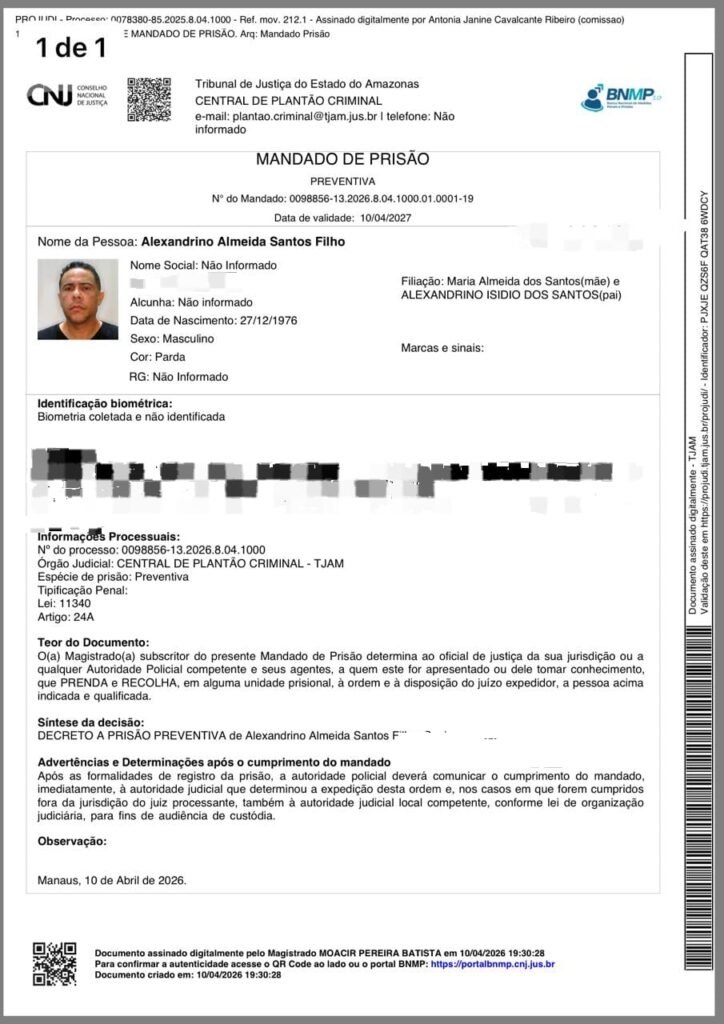 Com a nova decisão, a Justiça determinou que o investigado seja preso e encaminhado a uma unidade prisional, onde deverá permanecer à disposição do Judiciário. O mandado tem validade até abril de 2027 e prevê a realização de audiência de custódia após o cumprimento.
