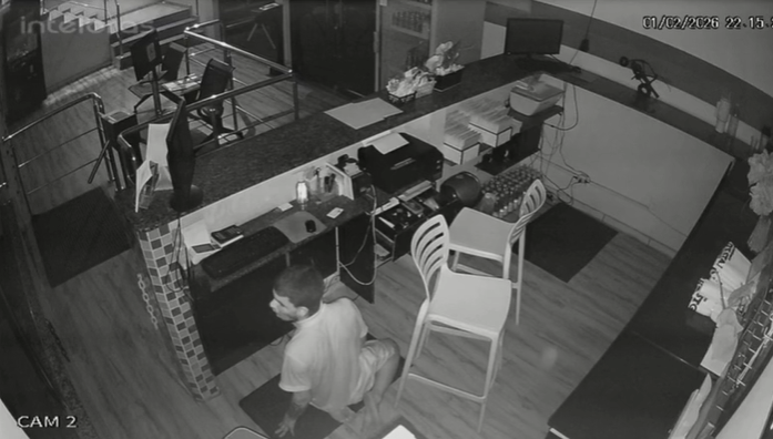 Câmeras de vigilância registraram o momento em que o homem entra na academia por volta das 22h. Nas imagens, ele aparece na área da recepção, onde começa a revirar o local em busca de objetos de valor.