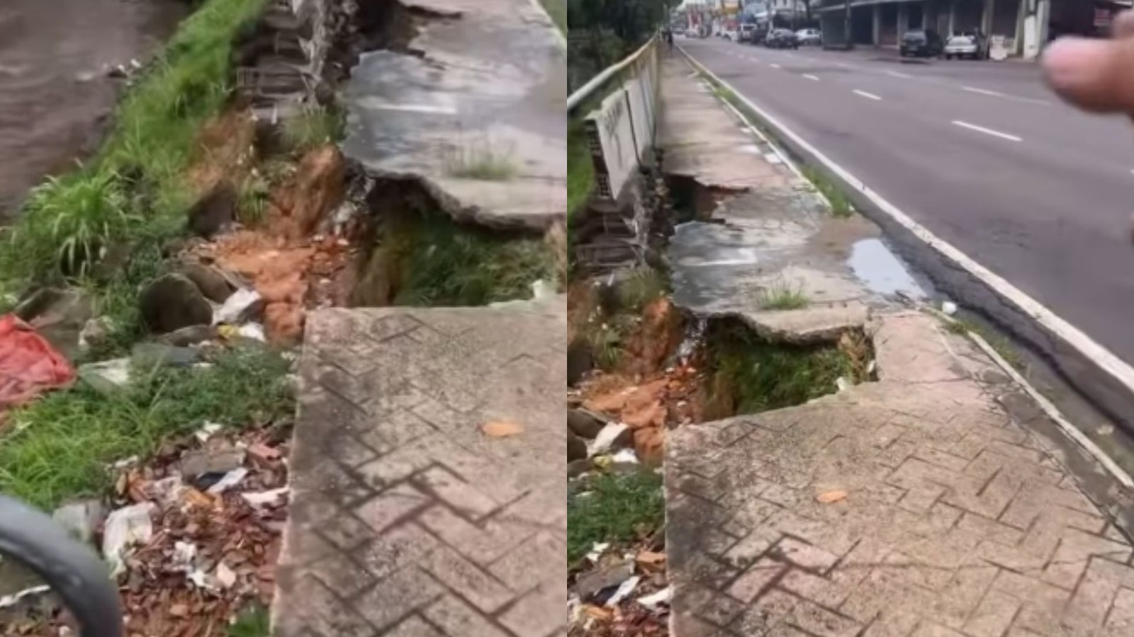 “Tá pra cair, ainda corre risco de levar a rua junto aí, rachando parte da avenida e causar um acidente grave na avenida Brasil. Onde deveria ser a passagem para os deficientes, tudo caindo e chuva vai derrubando mais”, diz um dos moradores.
