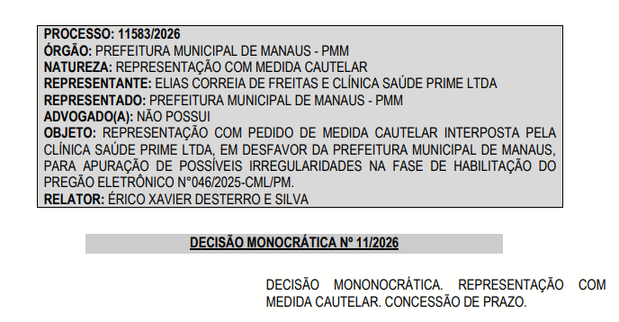 A representação foi apresentada pela empresa Clínica Saúde Prime Ltda, participante da licitação, que questiona a atuação da Comissão Municipal de Licitação (CML) durante a habilitação das concorrentes.