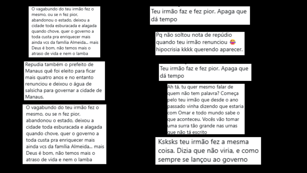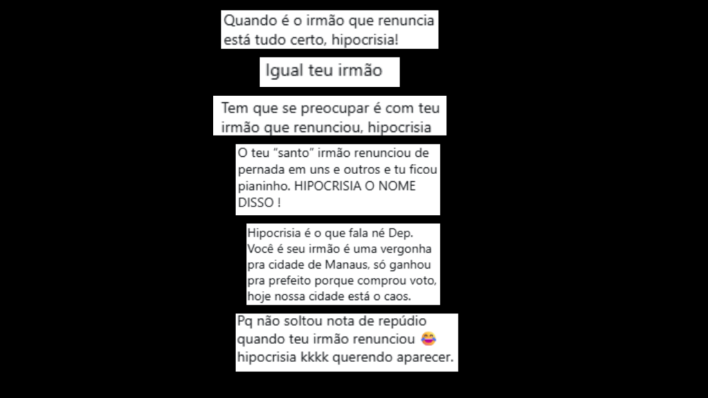 Alguns comentários ampliaram o tom das críticas, associando a renúncia à insatisfação com a gestão em Manaus e no Amazonas. Internautas citaram problemas urbanos, como buracos e alagamentos, e projetaram desgaste político sobre os irmãos Almeida.