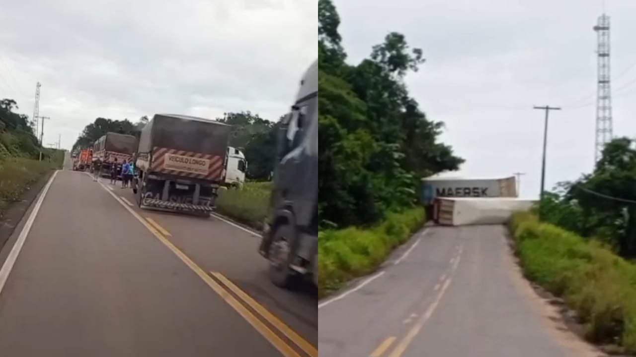 MANAUS (AM) – Duas carretas tombaram e provocaram a interdição da BR-174, na manhã desta quarta-feira, 1/4, no trecho da ladeira Maria Ceará, entre os municípios de Manaus e Boa Vista-RR. O bloqueio nos dois sentidos gerou longas filas e interrompeu o fluxo de veículos na rodovia.