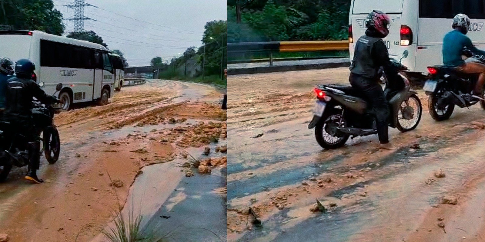Nas imagens é possível ver a via tomada por barro e veículos presos na lama que se formou após o desabamento do barranco.
