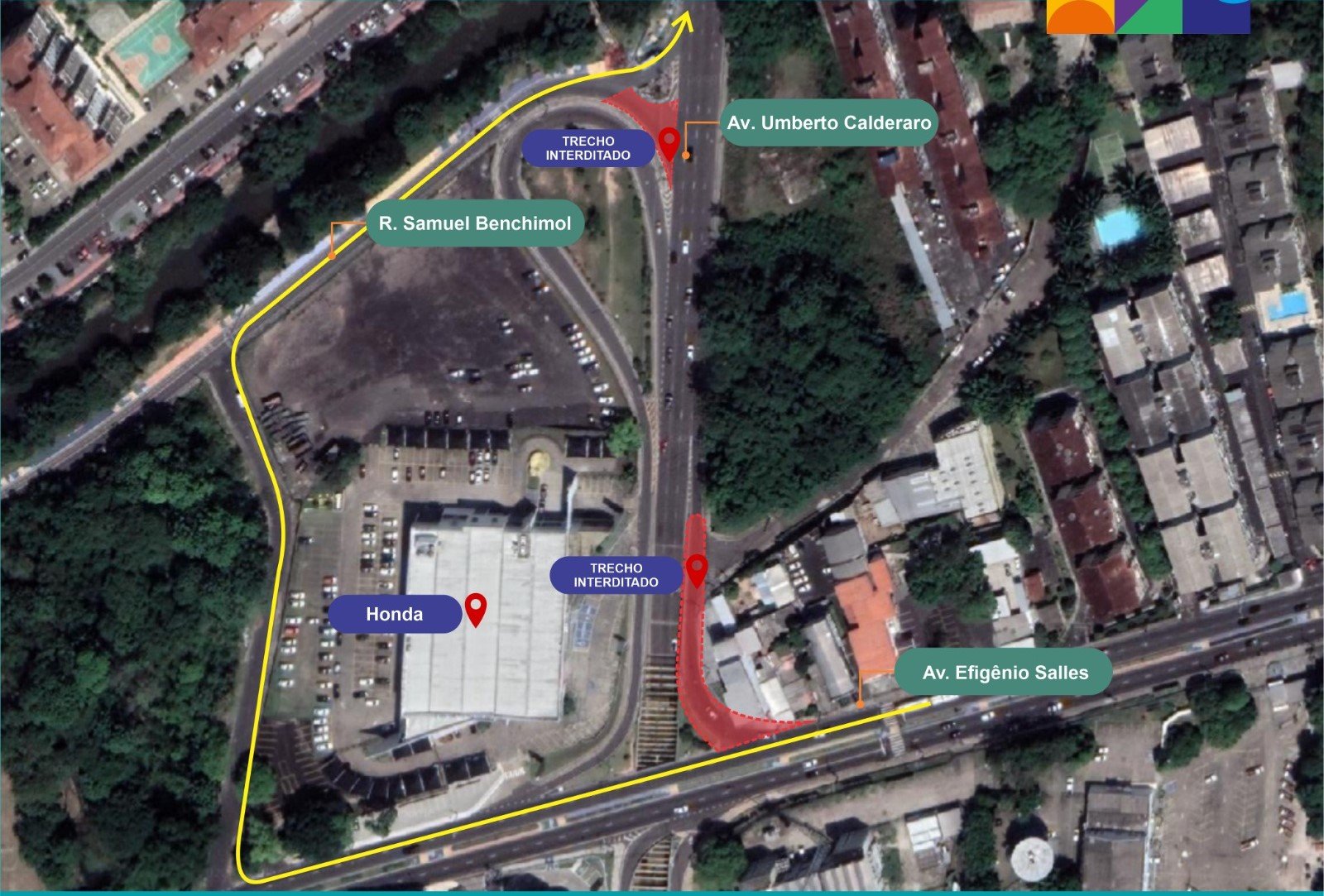 Por causa da mudança de circulação, a via de acesso da avenida Umberto Calderaro para a rua Samuel Benchimol também ficará interditada entre 0h de domingo até 4h de segunda. Serão mais de 24 horas com o trecho interditado.