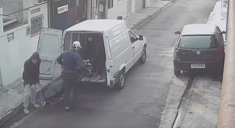 Após verificar a área, o suspeito abre a traseira da van, permitindo que outro criminoso saia de dentro do veículo. Um terceiro suspeito se junta à ação. Em um movimento rápido e coordenado, eles colocam a motocicleta dentro da van, modelo Fiat Fiorino.