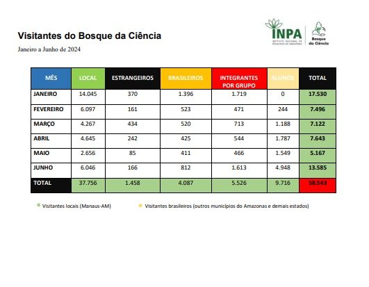 MANAUS (AM) – O Bosque da Ciência fecha o primeiro semestre deste ano com número super positivo de visitações. De janeiro a junho de 2024, mais de 58 mil visitantes conheceram as maravilhas da natureza, a fauna e flora que o lugar oferece como atrativo turístico.