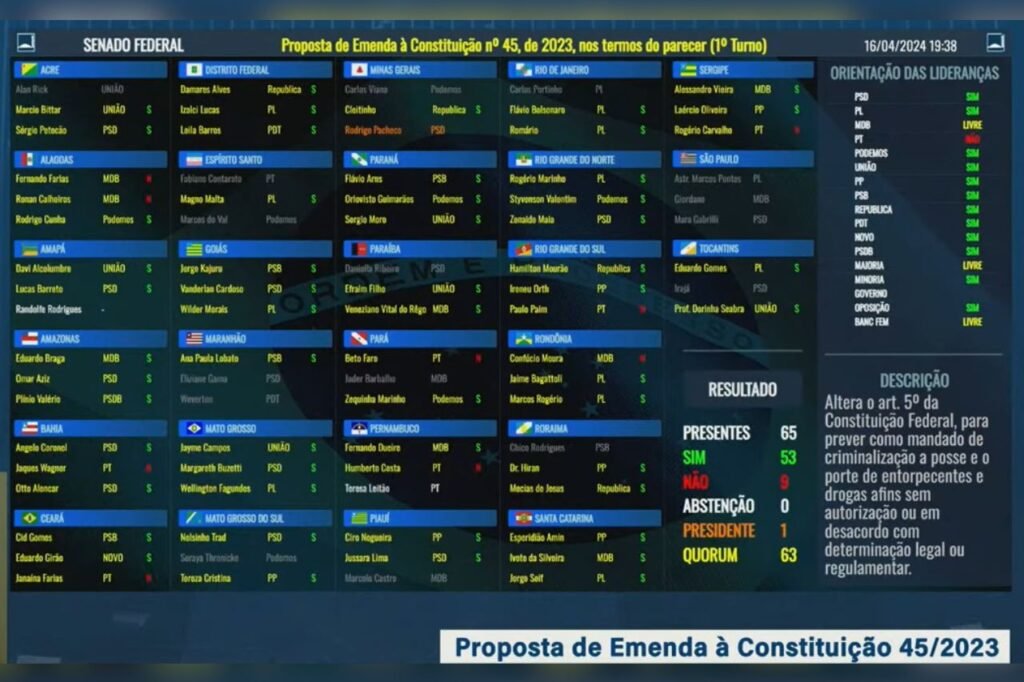 MANAUS (AM) – O Senado Federal aprovou, em dois turnos de votação, a Proposta de Emenda à Constituição (PEC) 45/2023 que criminaliza o porte e a posse de qualquer tipo de droga. A medida recebeu 53 votos a favor e 9 contra no primeiro turno, e 52 votos favoráveis e 9 contrários no segundo.
