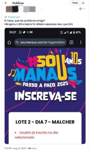 Além da lentidão e do esgotamento rápido, usuários relataram problemas técnicos ao tentar se inscrever. Uma internauta contou que, ao tentar acessar um novo lote, recebeu a mensagem de que já estava cadastrada, mesmo sem ter gerado o QR Code necessário para acesso.
