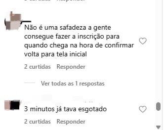 Uma das principais queixas refere-se ao tempo de espera no site e à instabilidade no momento da confirmação do cadastro. “Quando eu terminei de colocar as informações, o ingresso já havia esgotado”, relatou um usuário.