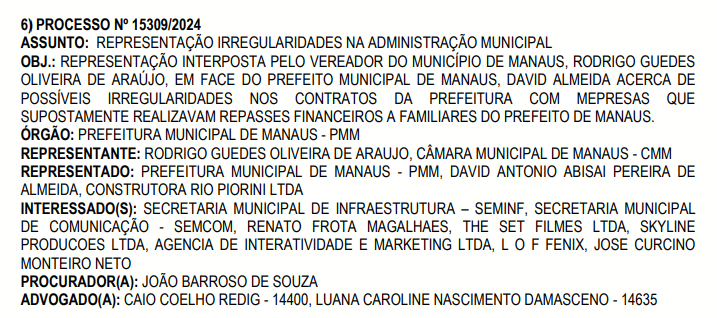 De acordo com o documento, a representação tem como alvos a Prefeitura de Manaus, o próprio prefeito David Almeida e a empresa Construtora Rio Piorini LTDA. O caso tramita sob o número de processo 15309/2024.