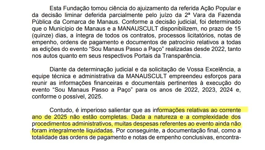 Porém, em documento entregue pela própria Fundação Municipal de Cultura e Artes (Manauscult), a autarquia afirma que os dados dessa edição ainda estão incompletos. “Dada a natureza e a complexidade dos procedimentos administrativos, muitas despesas referentes ao evento ainda não foram integralmente liquidadas”, diz a secretaria no documento.