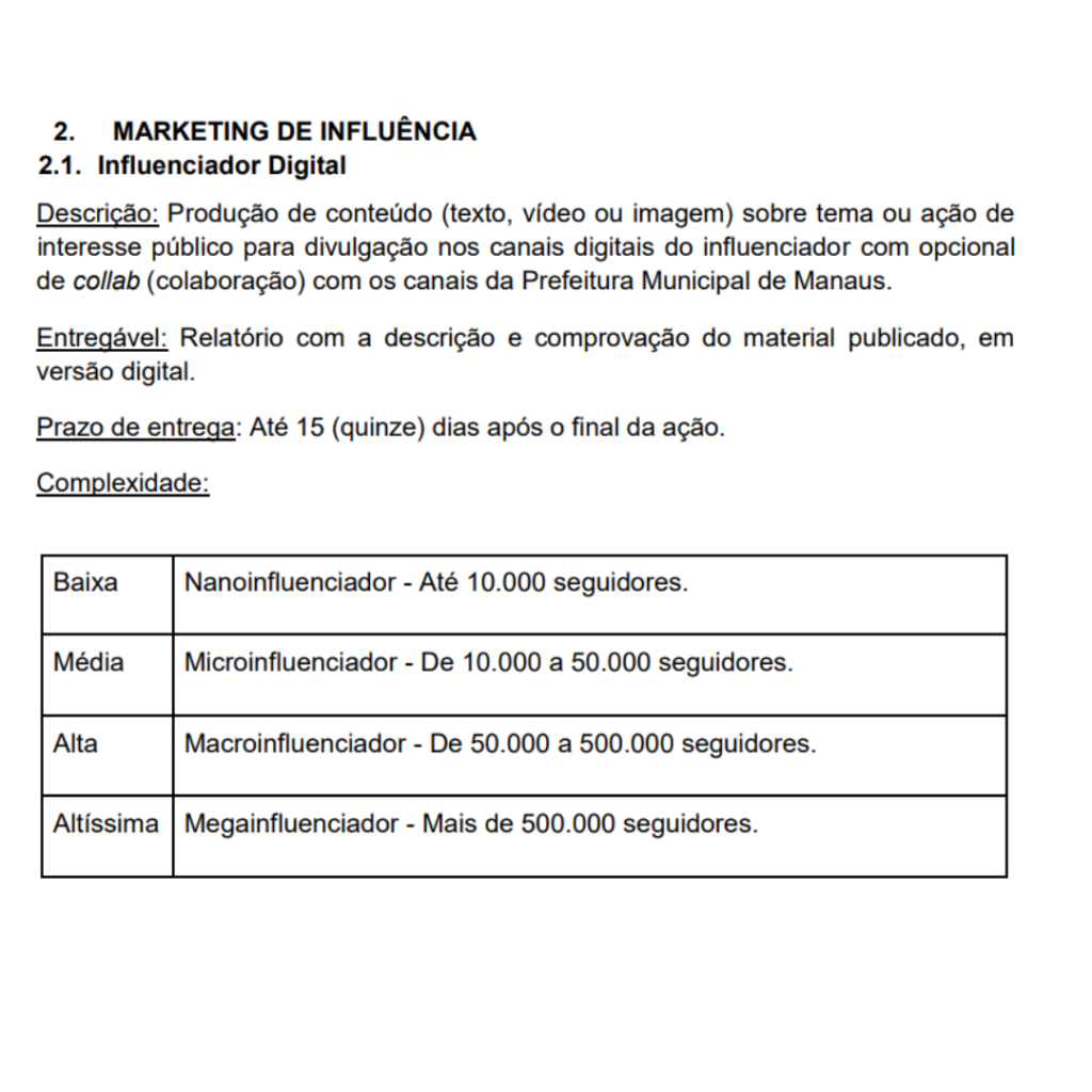 No edital da licitação (EC 001/2024 – CML/PM), há uma seção especifíca para a contratação de serviços de influenciadores digitais. Esses serviços consistem na produção de conteúdo, seja em texto ou vídeo, abordando assuntos de interesse público de Manaus, os quais serão postados nas redes sociais do influenciador. Existe também a possibilidade de colaboração com os canais da Prefeitura de Manaus.