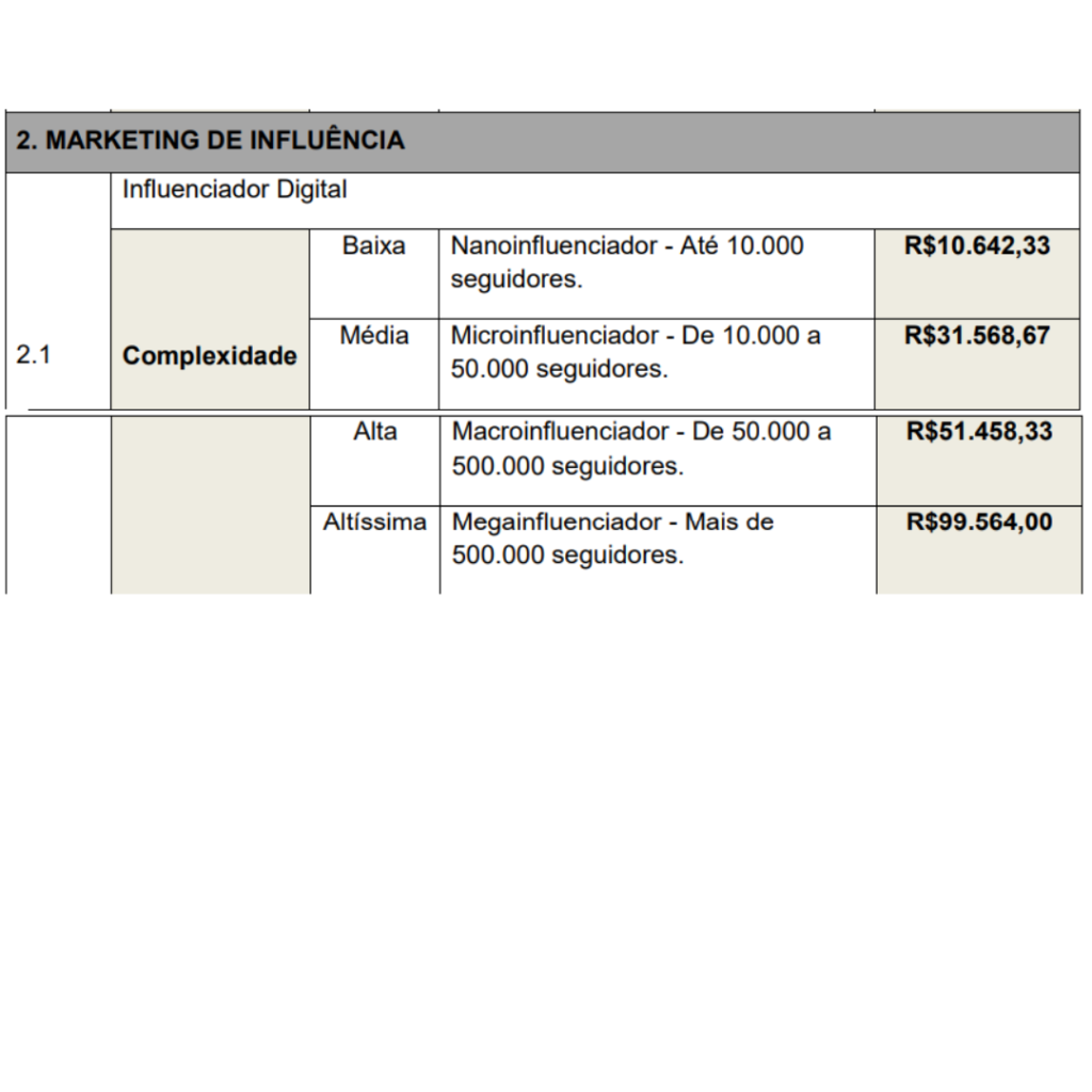 Os pagamentos pelos serviços levam em consideração o número de seguidores dos influenciadores. Para os nanoinfluenciadores, ou seja, aqueles com até 10 mil seguidores, os valores começam em R$ 10.642,33. Para os microinfluenciadores, com 10 a 50 mil seguidores, os valores são de R$ 31.568,67. Os macroinfluenciadores, que possuem de 50 mil a 500 mil seguidores, podem receber até R$ 51.458,33. O valor mais alto, de R$ 99.565,00, destina-se às páginas com mais de 500 mil seguidores, consideradas megainfluenciadoras.