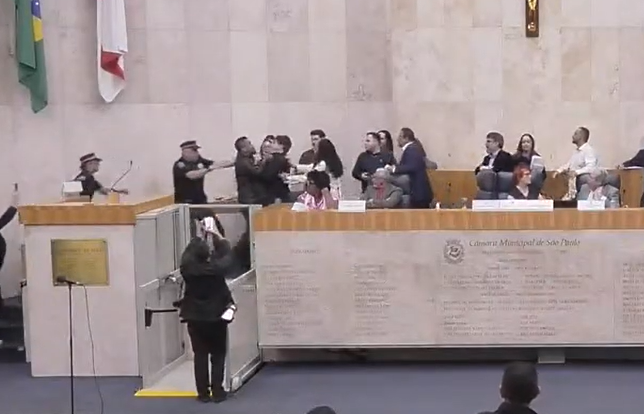 “Gil dos Motoboys”, como é conhecido o sindicalista, se dirigiu até a tribuna e pegou o vereador pela camisa, momento em que assessores e a segurança da Câmara interviram para separar ambos.