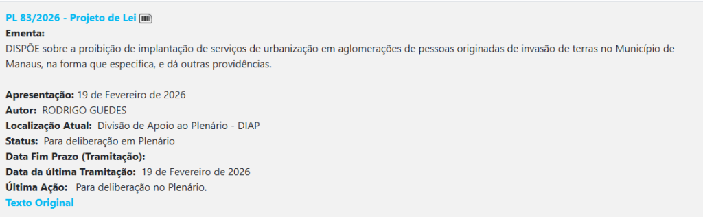 MANAUS (AM) – O vereador Rodrigo Guedes (PP) apresentou à Câmara Municipal de Manaus (CMM) o Projeto de Lei nº 083/2026, que propõe proibir a implantação de serviços de urbanização em áreas ocupadas a partir de invasões de terras na capital amazonense. A matéria aguarda deliberação em plenário.