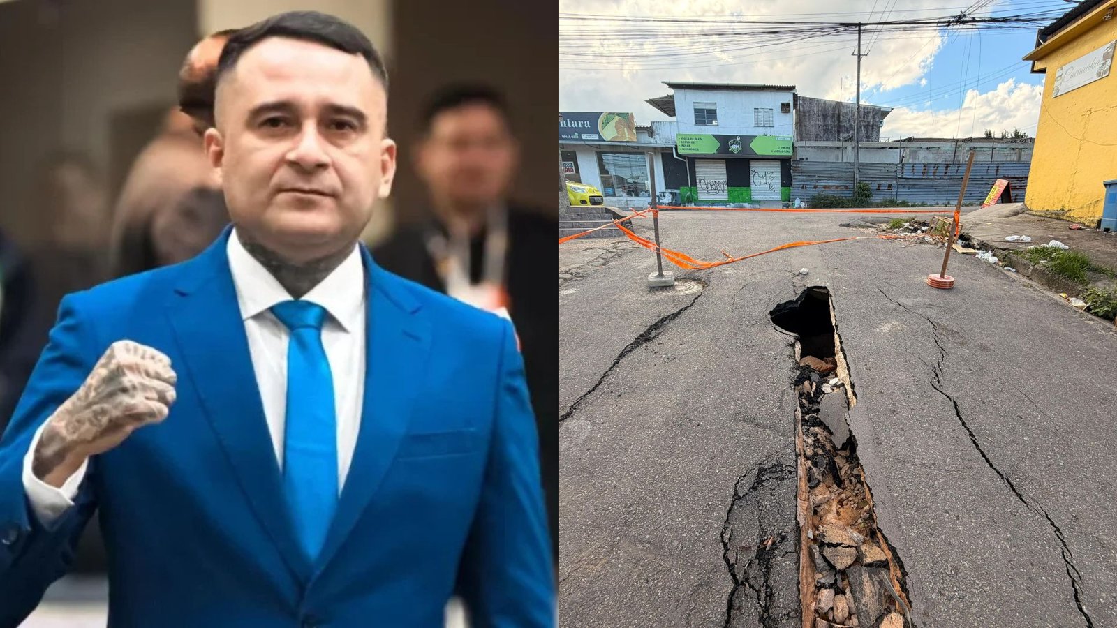 O requerimento traz imagens registradas por moradores que mostram o solo oco sob o pavimento, aumentando o risco de desabamento e acidentes com pedestres e motoristas.
