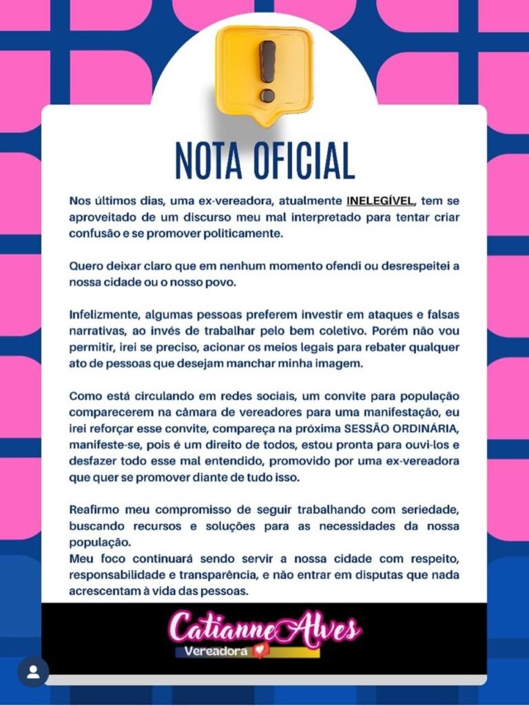 A REDE RIOS procurou a vereadora Catianne Alves para comentar as declarações e a manifestação da população sobre o assunto. Por meio de nota, a parlamentar afirma que “em nenhum momento” ofendeu ou desrespeitou a cidade ou o povo, atribuindo a repercussão a um “discurso mal interpretado” e a “ataques e falsas narrativas” de uma ex-vereadora.