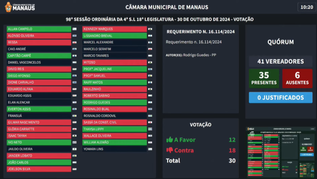 Os que votaram contra incluíram: Alonso Oliveira (AGIR), David Reis (Avante), Dione Carvalho (AGIR), Eduardo Alfaia (Avante), Gilmar Nascimento (Avante), Isaac Tayah (MDB), Mitoso (MDB), Prof. Samuel (PSD), Raulzinho (MDB), Roberto Sabino (Republicanos), Rosinaldo Bual (AGIR), Sassá da Construção Civil (PT) e Wallace Oliveira (DC).