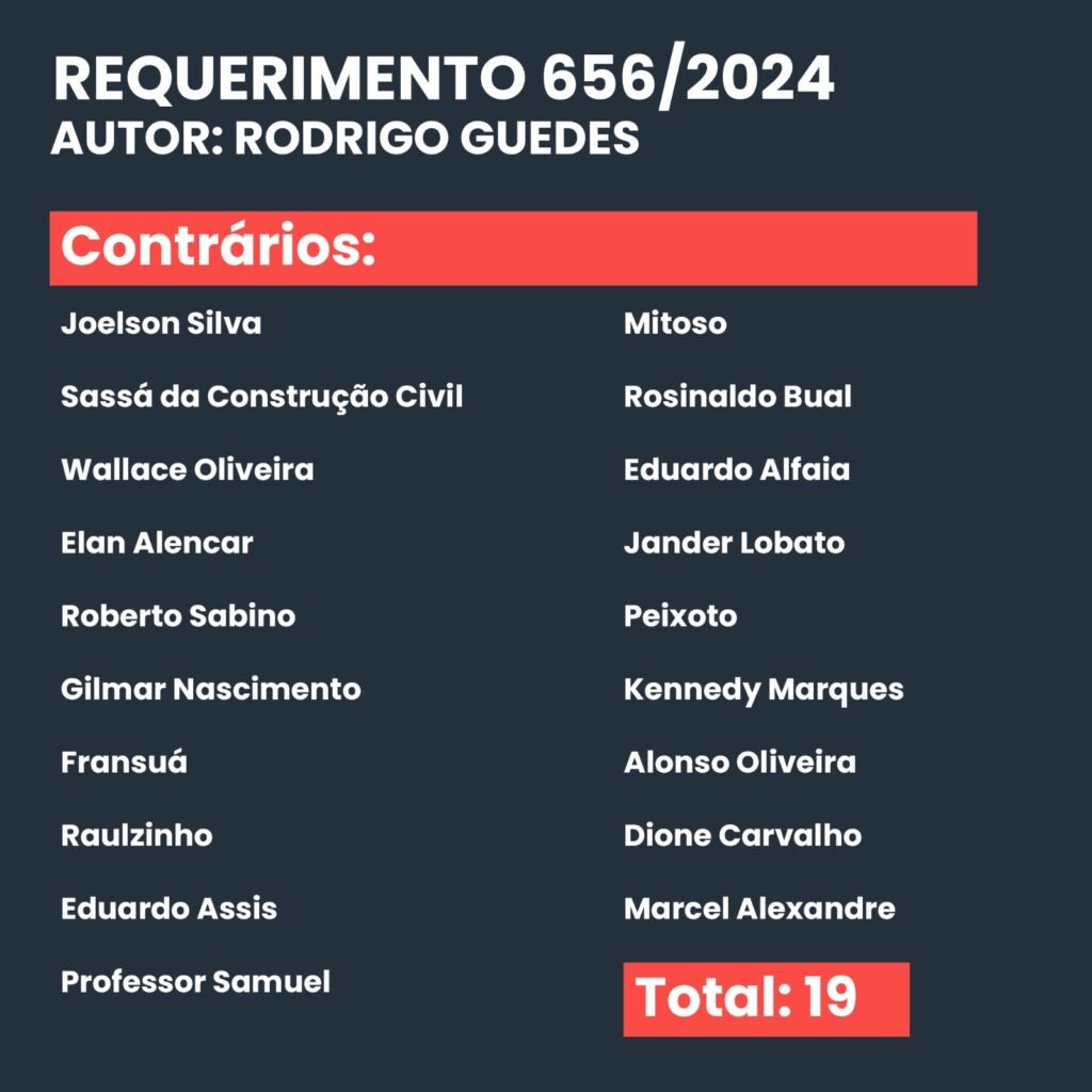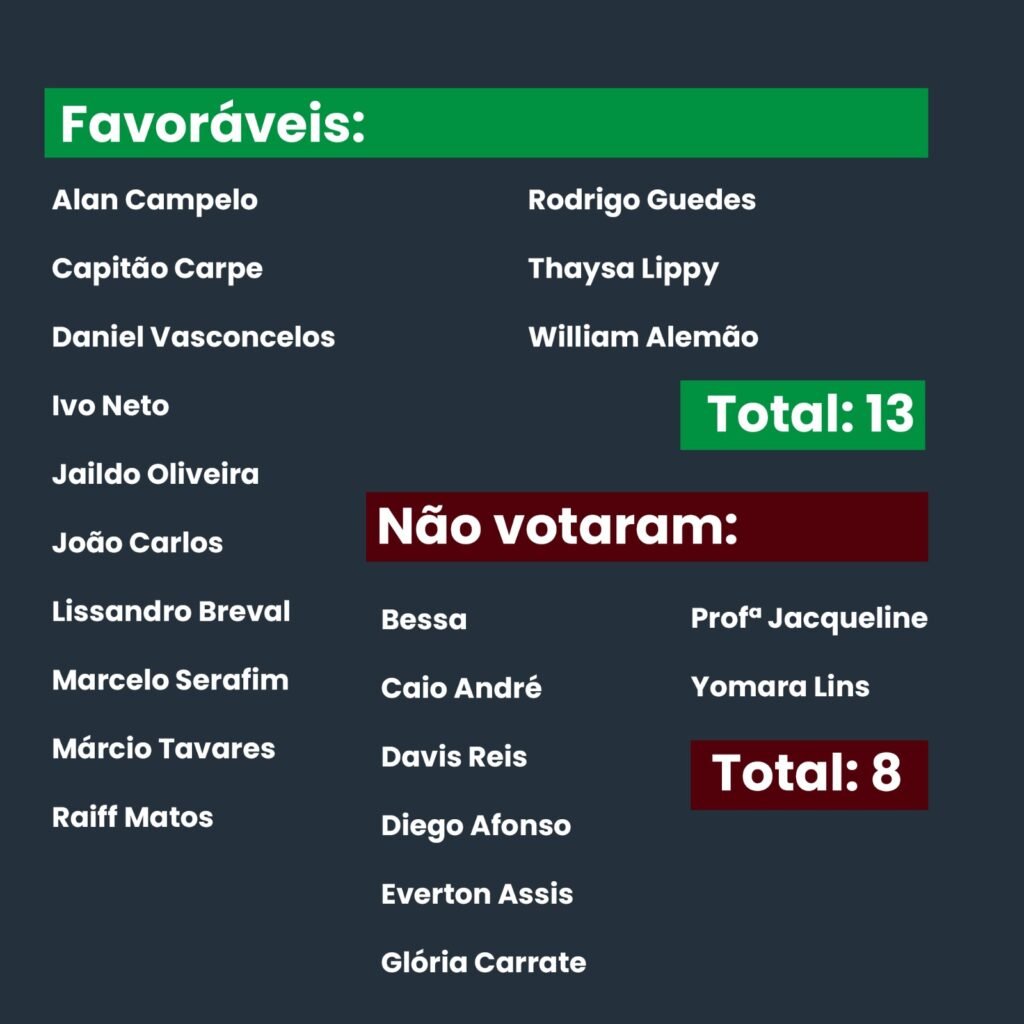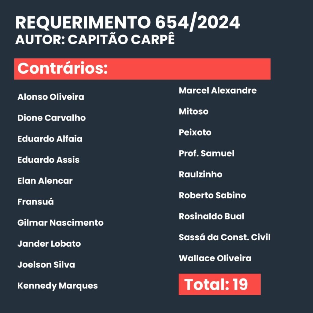 Durante a sessão parlamentar, dois requerimentos foram submetidos à votação. O primeiro, proposto pelo vereador Capitão Carpê (Republicanos), obteve 19 votos contrários e 13 favoráveis.