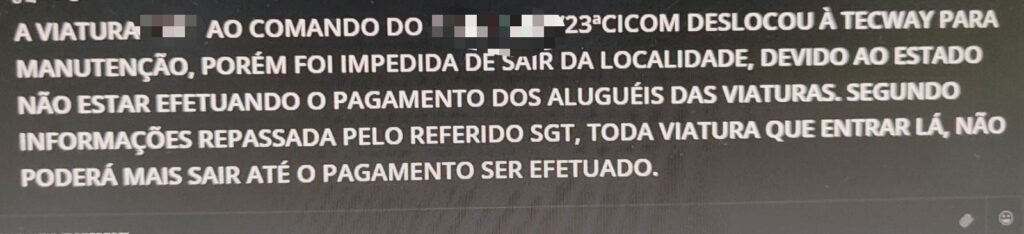 De acordo com a denúncia encaminhada ao Portal RIOS DE NOTÍCIAS em 6 de novembro, uma viatura de patrulhamento foi deslocada até a Tecway para a realização de manutenção. Contudo, ao tentar sair da empresa após o serviço, a viatura foi impedida de seguir seu trajeto devido à falta de pagamentos entre a Polícia Militar e a locadora.