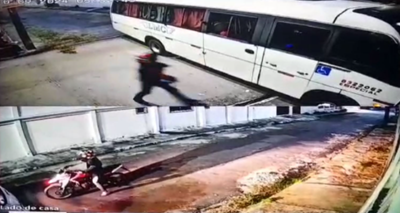 Nas imagens, um trabalhador do Polo Industrial de Manaus (PIM) está aguardando a rota na esquina da rua, momento em que o veículo chega, ele entra e, ao motorista fechar as portas e sair, a dupla criminosa aparece rapidamente e bloqueia a passagem do veículo.