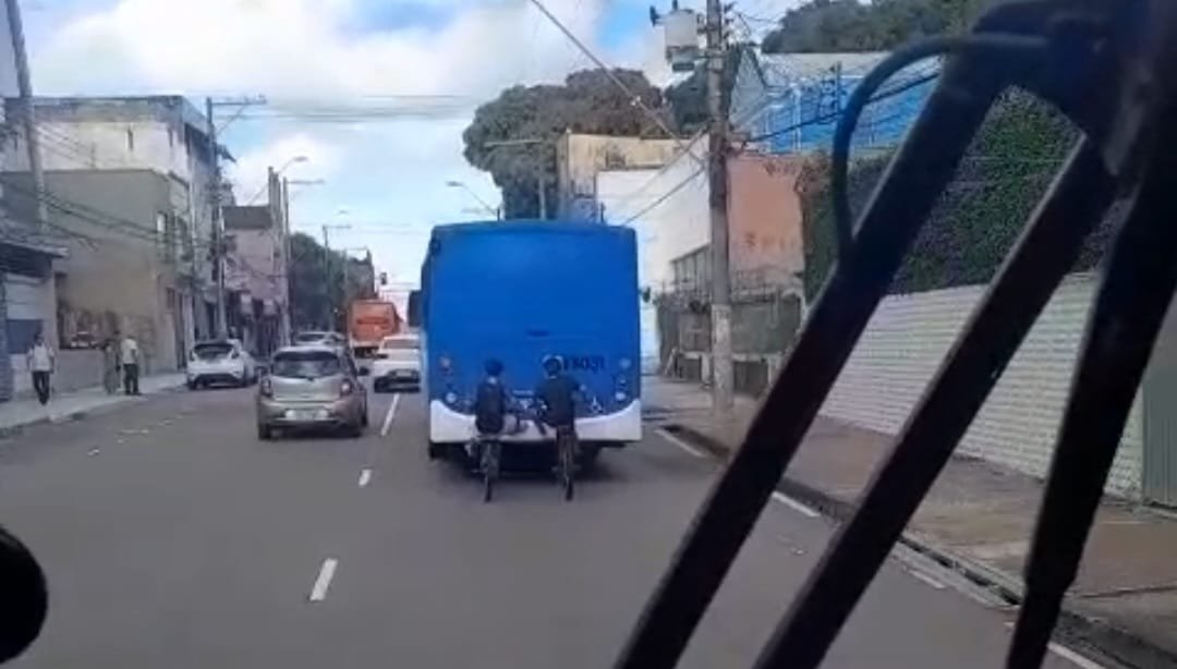 Nas imagens, os jovens aparecem sendo puxados pelo ônibus em movimento, prática arriscada que chamou a atenção de quem presenciou a situação. Durante a gravação, o motorista faz um alerta: “depois que morre, a culpa é do motorista”, destacando o perigo da atitude.