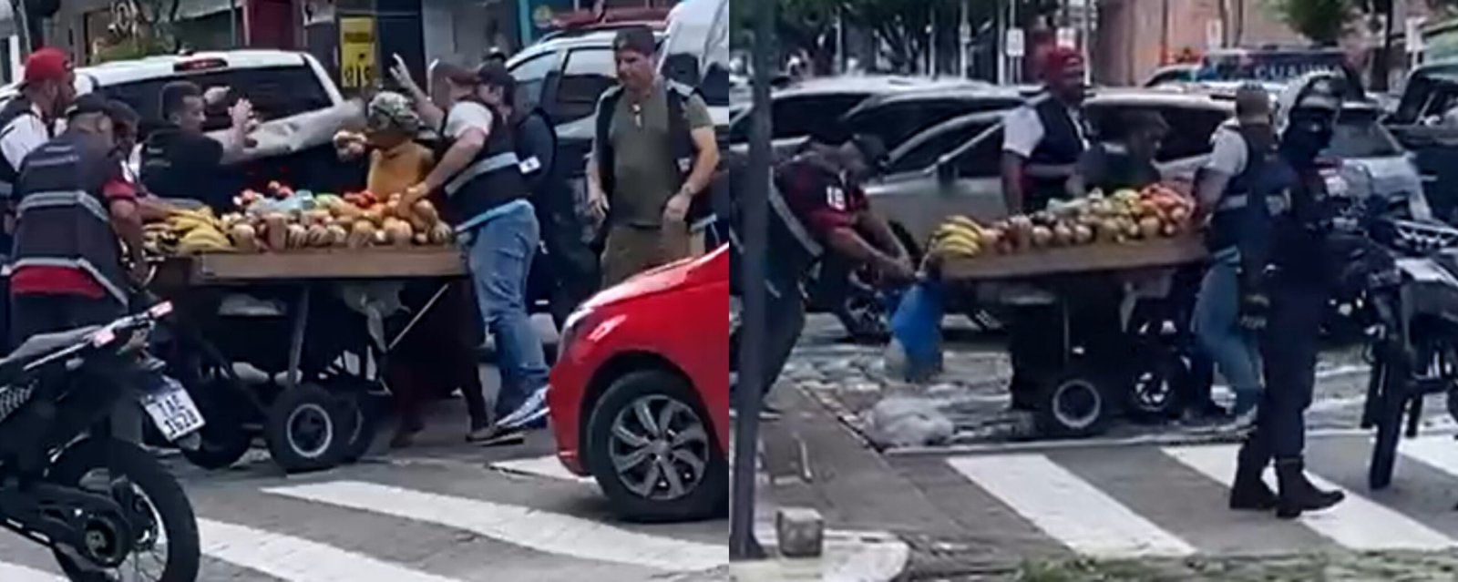 Pelas imagens, é possível visualizar agentes fardados pegando o carrinho de madeira improvisado e arremessando as frutas na carroceria de um veículo de fiscalização. A abordagem é acompanhada por uma equipe da Guarda Municipal.