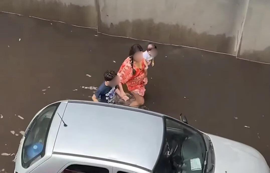 MANAUS (AM) – Pedestres registraram o momento em que uma mulher, que estava com duas crianças (sendo uma delas de colo), tenta mover seu carro que ficou preso após alagamento na passagem de nível da avenida Darcy Vargas com a Djalma Batista, na zona Centro-Sul de Manaus.