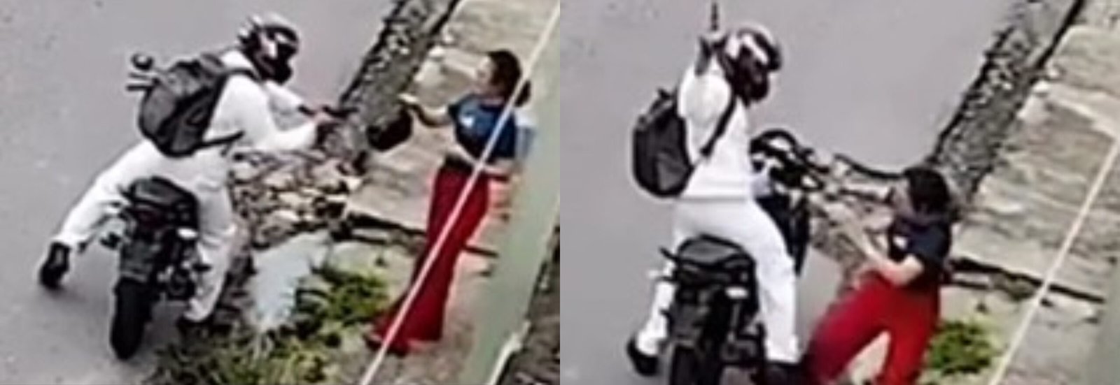 Ainda conforme o vídeo, o homem insiste em puxar a bolsa e a mulher se nega a entregá-la facilmente. Ele então desce da moto, vai para cima da mulher e violentamente subtrai suas coisas enquanto retorna ao veículo. O suspeito consegue empreender fuga, mas a mulher não desiste, sendo arrastada, caindo na via e quase sendo atropelada por um carro que passava no momento.