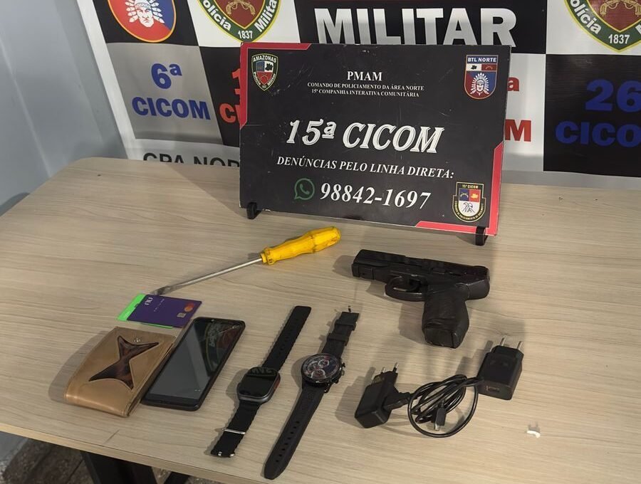 Durante a revista, os policiais encontraram com o homem uma pistola, dois relógios, uma chave de fenda, dois carregadores, um celular e uma carteira contendo cartão de crédito.