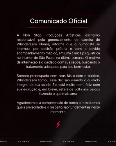 “Sempre preocupado com seus fãs e com o público, Whindersson tomou essa decisão visando o cuidado integral de sua saúde. Ele está muito bem, feliz com sua evolução e, em breve, estará de volta aos palcos fazendo o que mais ama”, afirmou o comunicado.