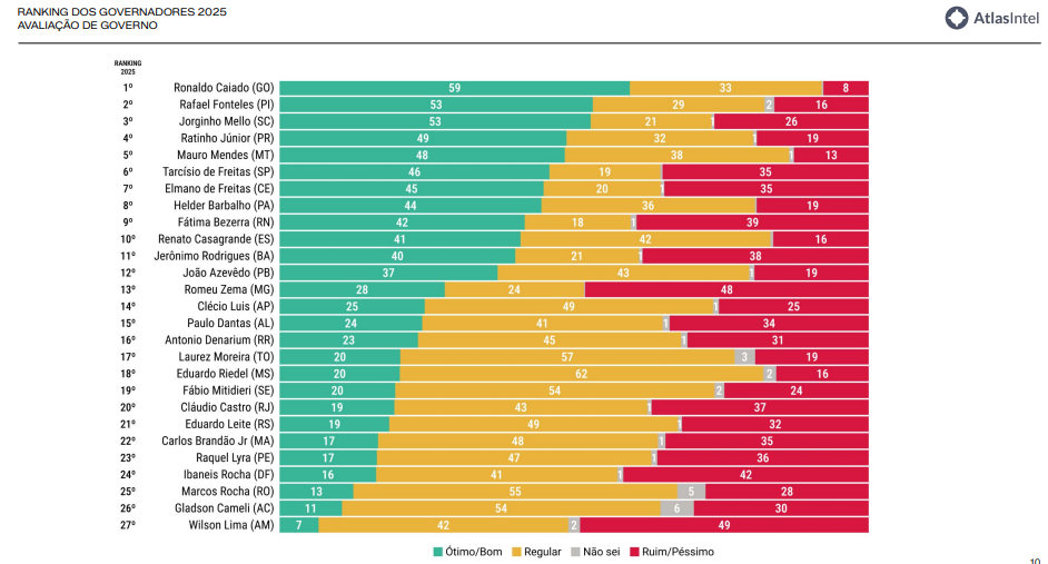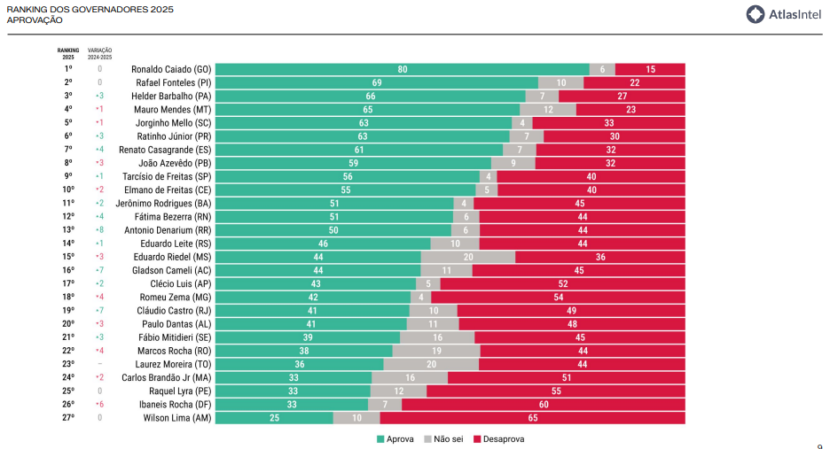 Segundo o estudo, que avalia o desempenho de todos os chefes do Executivo estadual do país, o governador caiu 11 posições em relação ao levantamento realizado em 2023, ficando novamente em último lugar.